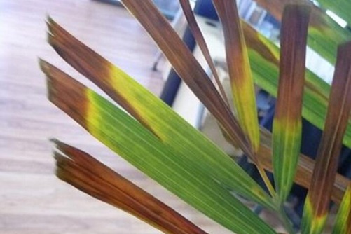 缺鉄,叶肉变黄,叶面呈绿色网状纹;严重时全叶黄白,叶缘枯焦、脱落,也有枯梢现象。矫治方法是,盆土增施0.1~0.25%的硫酸亚铁溶液,或将硫酸亚铁粉末与有机肥按1:5比例混合施人,浇水后覆土;或叶面追施0.05~0.1%的硫酸亚鉄或柠酸液;或树干注射0.05%的硫酸亚铁溶液。